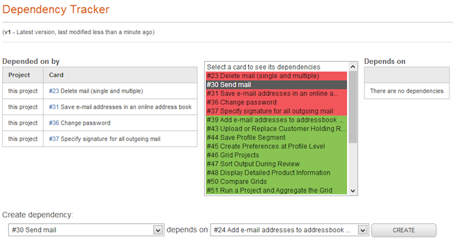 The Mingle Dependency Tracker allows dependencies between cards and projects to be recorded and tracked. The tracker (which can be customized further) displays a table of cards with both the cards that they depend on and those that are dependent on them. Cards are color-coded to indicate if their dependencies have been met or not.