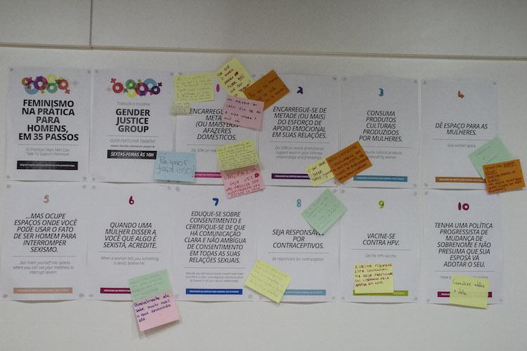 Lots of questions were raised and answered. For example, when people got confused about what "space" meant on the fourth item of the list, notes were added explaining that women could feel intimidated by the mere presence of an unknown man in a public area, and how this can be offset by offering some physical distance. Lots of comments were also posted about the first item, questioning the best way to fairly divide housework. Answers quickly appeared, pointing out that this kind of work is usually considered a woman's job, even if she works full-time. We got to analyze empirical ways to make feminism and the fight for gender equality a bigger part of our daily lives.