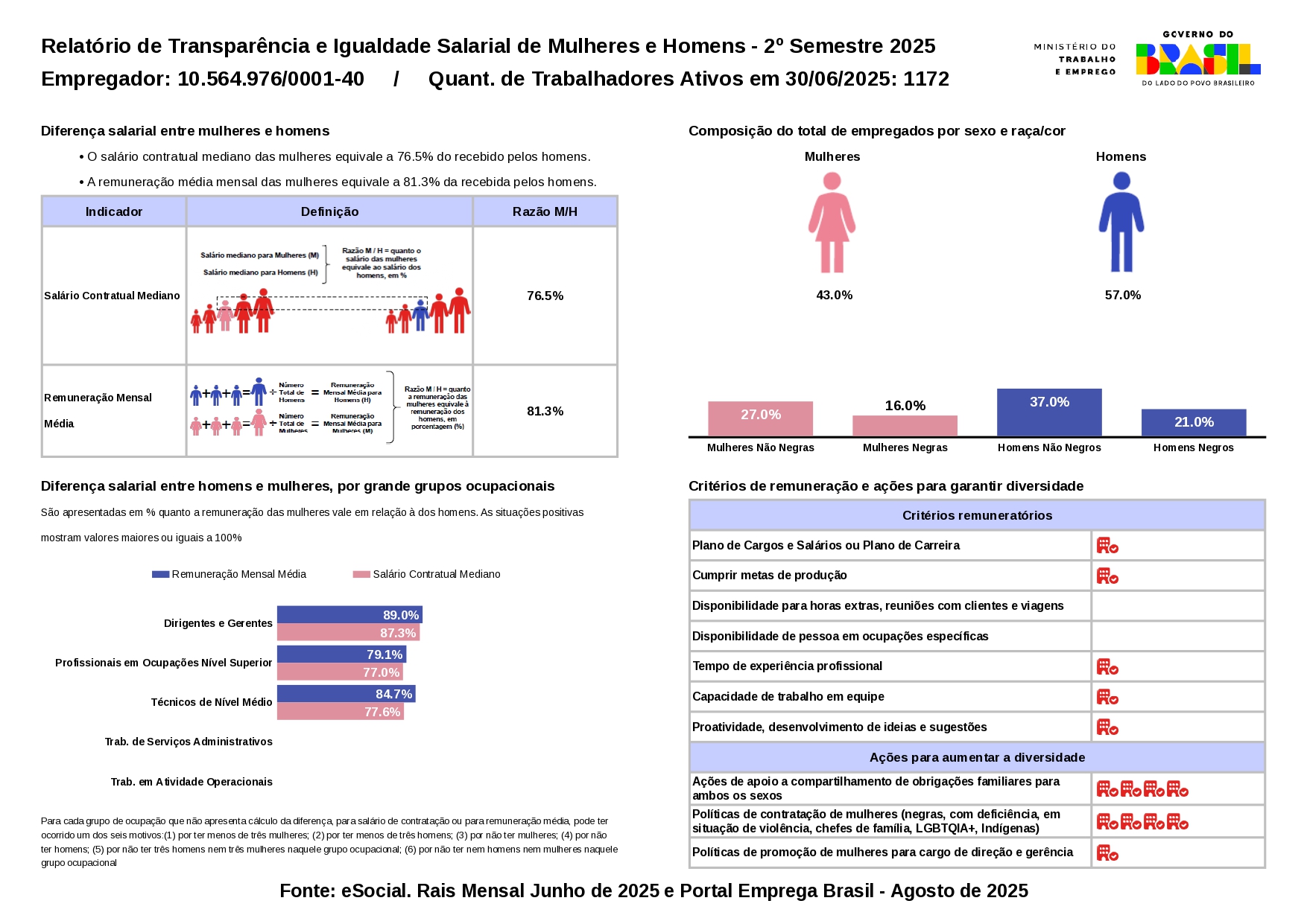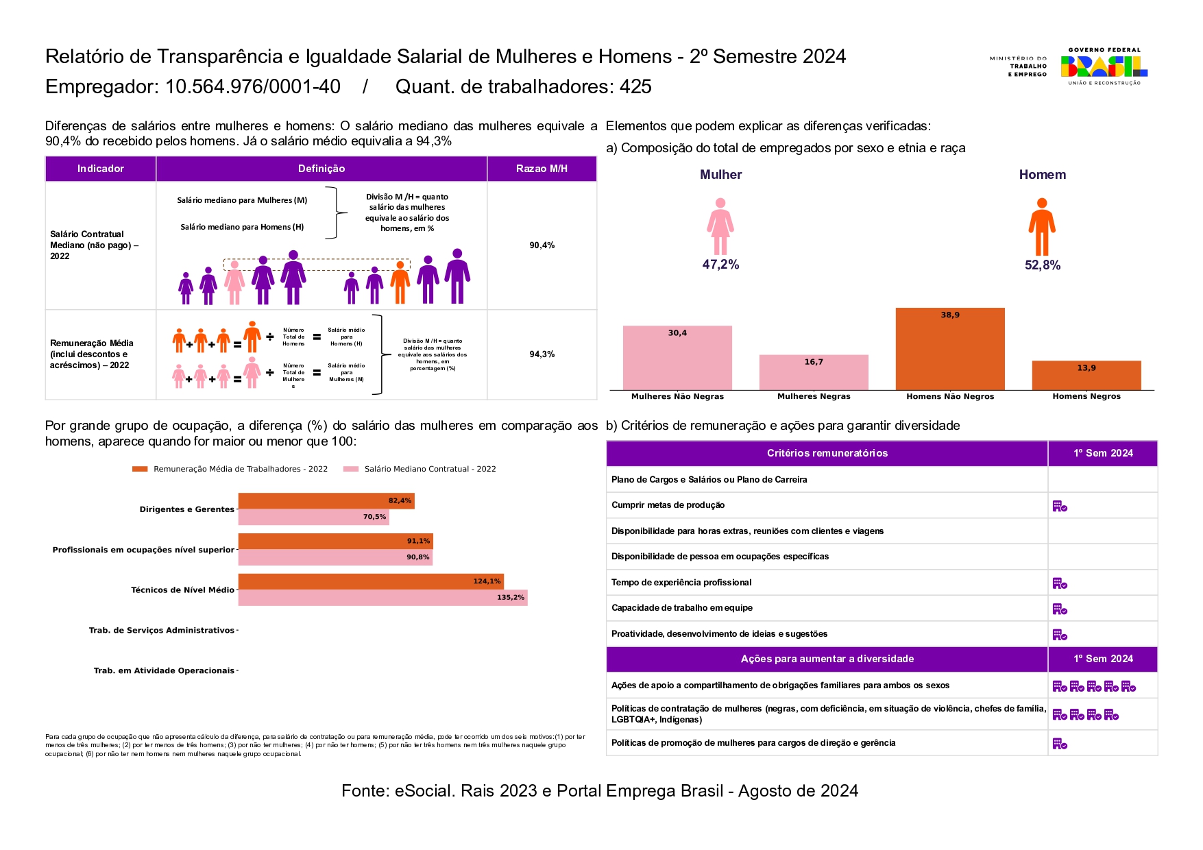 Os relatórios aqui apresentados trazem um recorte temporal e não devem ser lidos sem o contexto completo da nossa operação, negócio e práticas. Entendemos que nossos números demonstram que seguimos na vanguarda, quando comparados com os números compilados nacionalmente, e que ainda há um esforço em conjunto para a diminuição das diferenças de tratamento entre pessoas de diferentes gêneros e raças na nossa indústria, mercado e país. Reforçamos uma vez mais o nosso papel nessa construção.