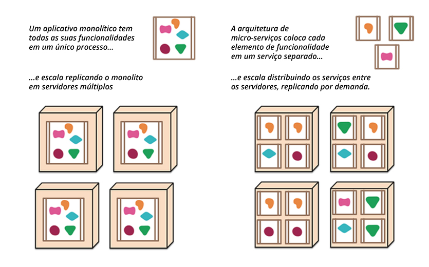 Essas frustrações levaram à criação do estilo de arquitetura de microsserviços: construir aplicativos como suites de serviços. Assim como os serviços têm deploy independente e são escaláveis, cada serviço também possui um limite de módulo firme, que permite inclusive que diferentes serviços sejam escritos em diferentes linguagens de programação. Eles também podem ser gerenciados por equipes diferentes.
