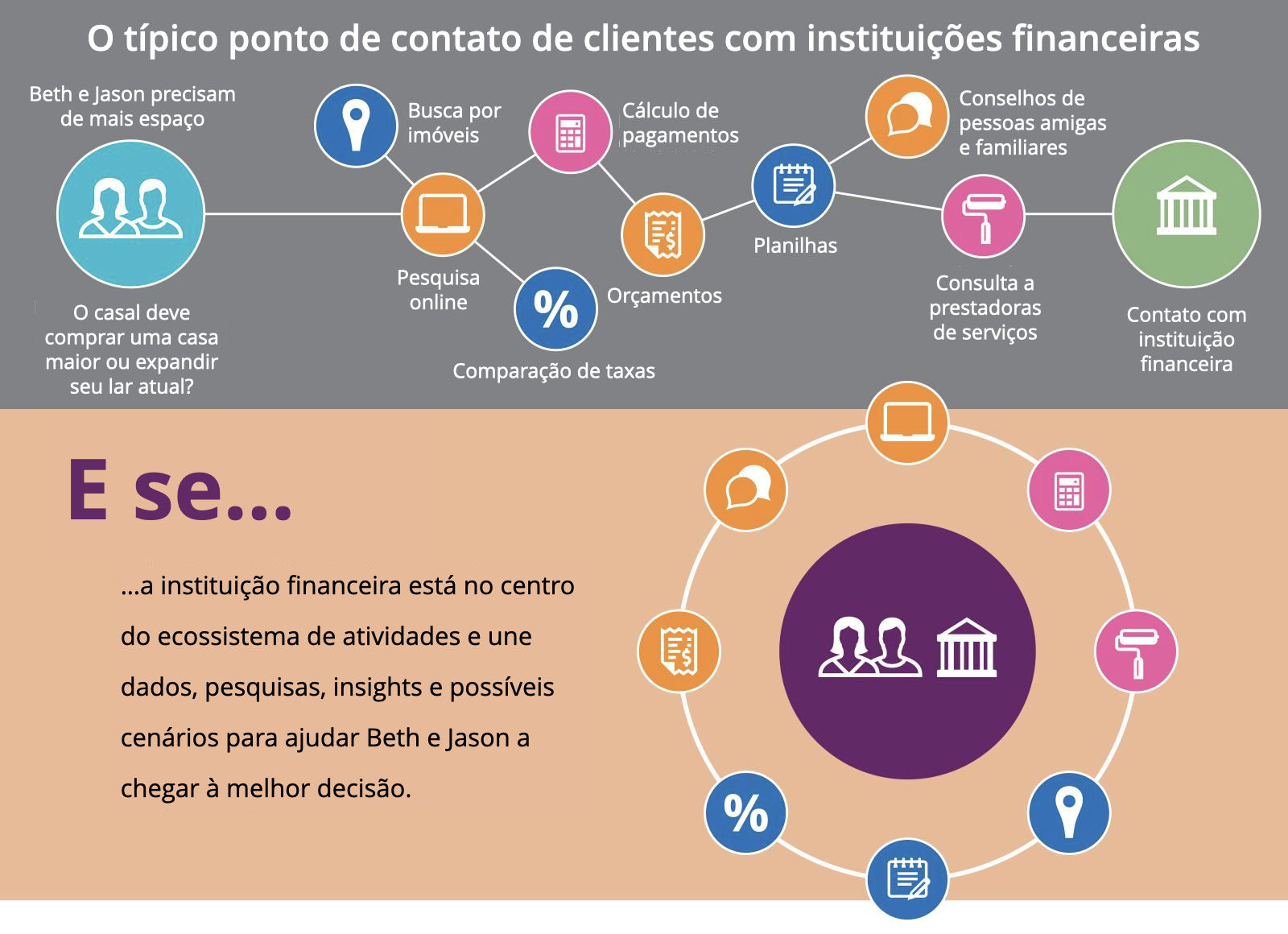 Hoje: o casal neste cenário tem uma série de tarefas e atividades para ajudá-los a tomar sua decisão, desde fazer sua própria pesquisa, conversar com pessoas amigas e família a acessar diferentes websites para descobrir tarifas, preços de casas e outros tipos de dados. O primeiro ponto de contato que a instituição de serviços financeiros tem com este casal é quando eles finalmente decidem sobre uma hipoteca ou uma linha de crédito imobiliário. Em outras palavras, no final da jornada de cliente.