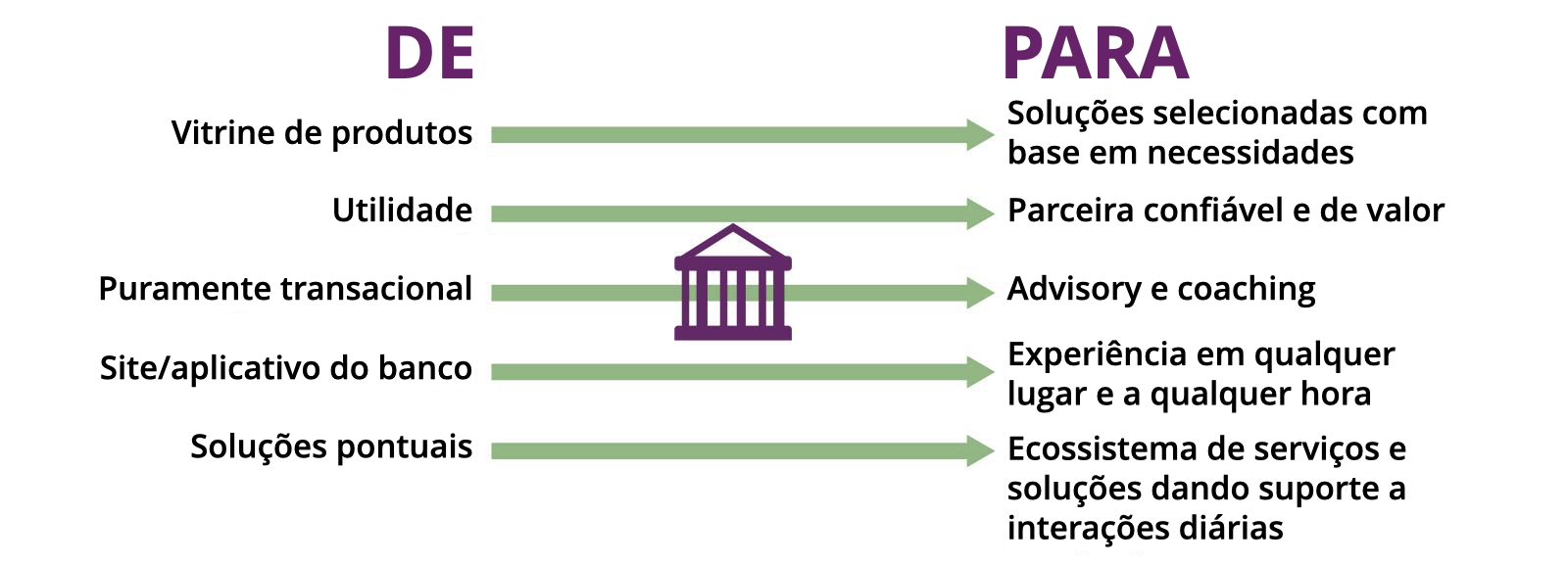 Os benefícios de reposicionar o papel do banco na sua jornada de consumo são imensos. A organização de serviços financeiros evoluir de ser uma entidade transacional para uma focada em construir uma relação e atender clientes onde que que estejam (Figura B). Em outras palavras, você, como organização provedora de serviços financeiros, é capaz de se colocar em uma posição mais estratégica, proativa e relevante.