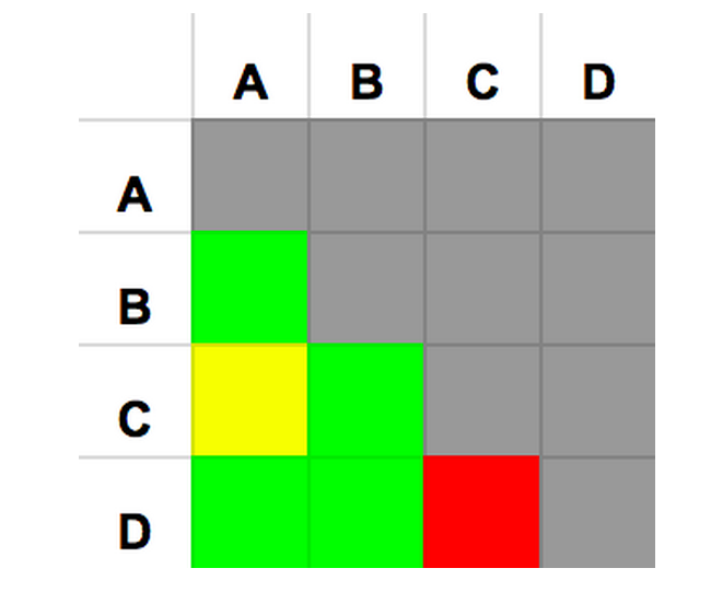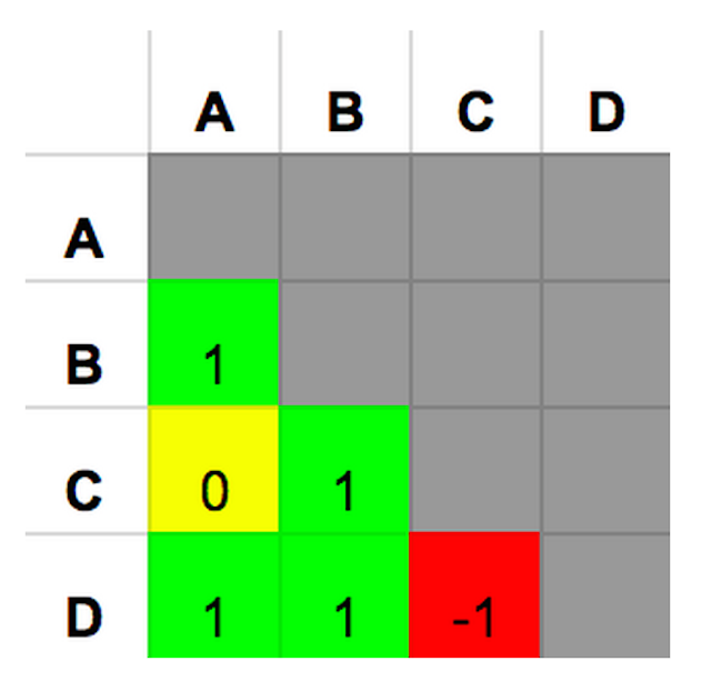 Mas vamos olhar novamente: imagine que os quadrados verdes contam como relações completamente saudáveis, enquanto o amarelo conta como neutro (zero) e o vermelho conta como uma relação negativa que está prejudicando o time (logo, subtraindo do total de relações). Algo como isto: