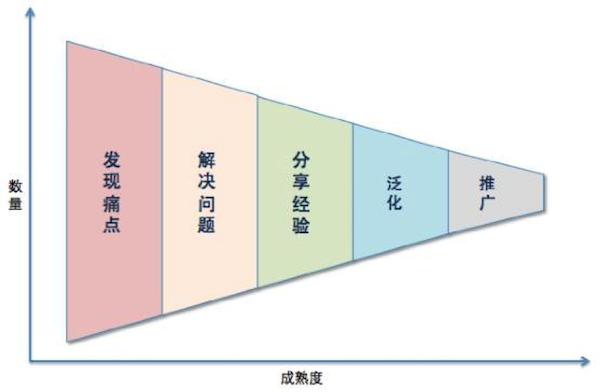 “创新漏斗”这个模型有助于我们理解打造创新型企业的关键点:第一,保障源头丰沛,有大量的创新点子被发现出来;第二,保障流通顺畅,消除各个阶段之间的障碍。具体而言,创新漏斗分为五个主要的阶段:发现痛点、解决问题、分享经验、泛化、推广,各个阶段有不同的关注点。